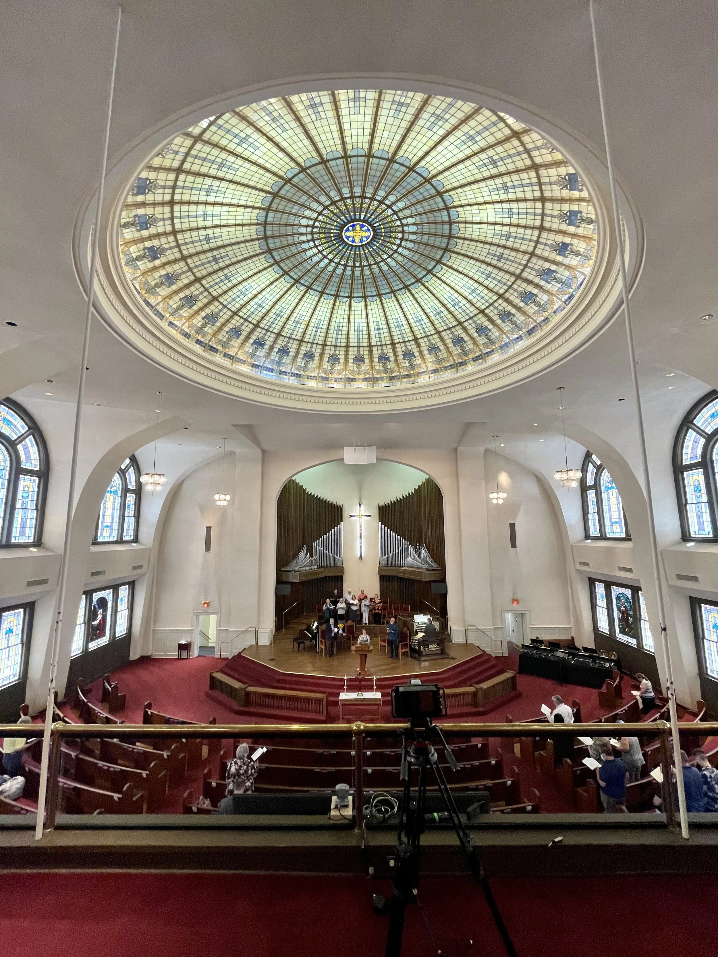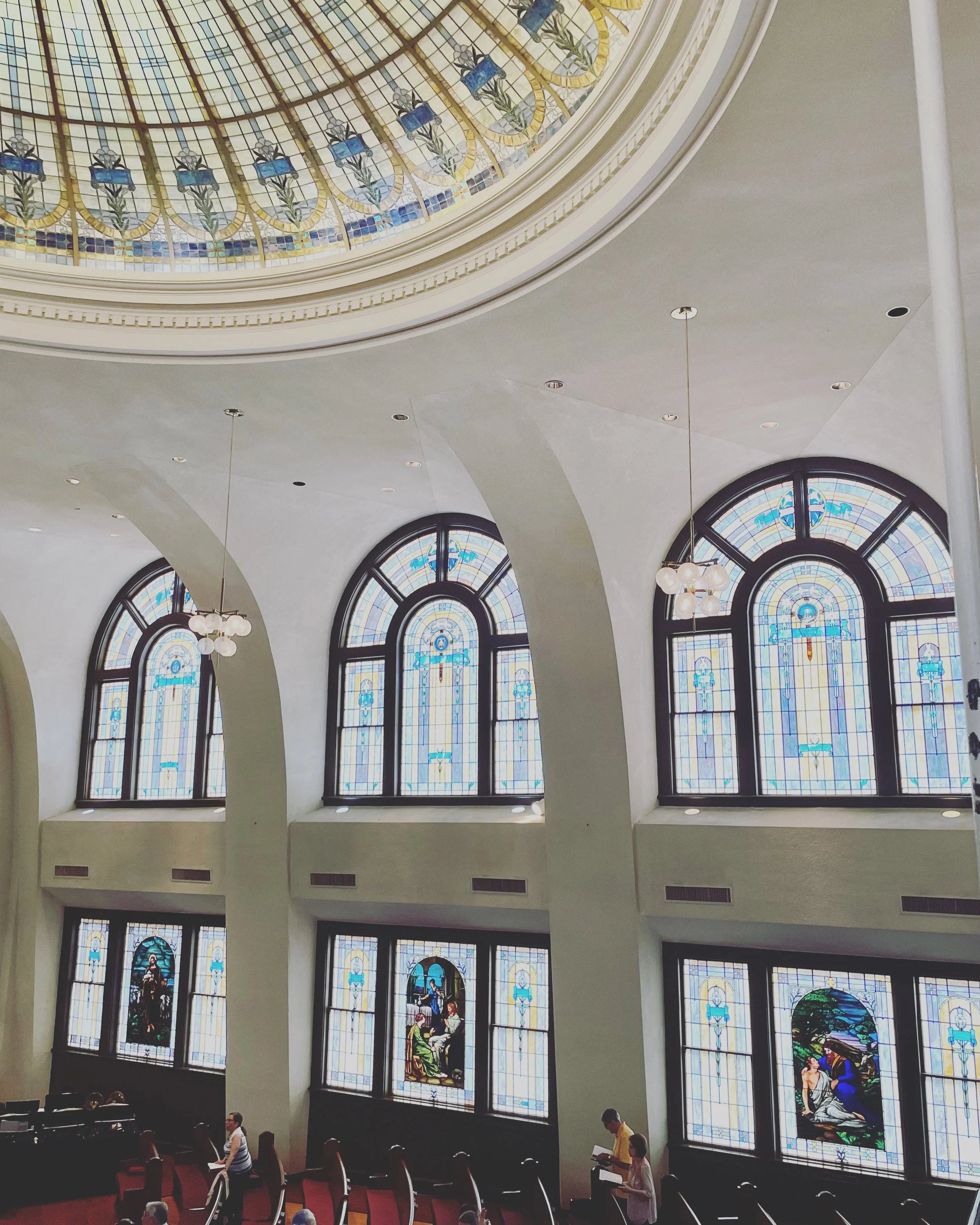 1926: The first of the church’s beautiful stained-glass windows was donated. Similar gifts followed, and the windows and dome of the sanctuary beautifully illustrate the gospel message to all who enter.